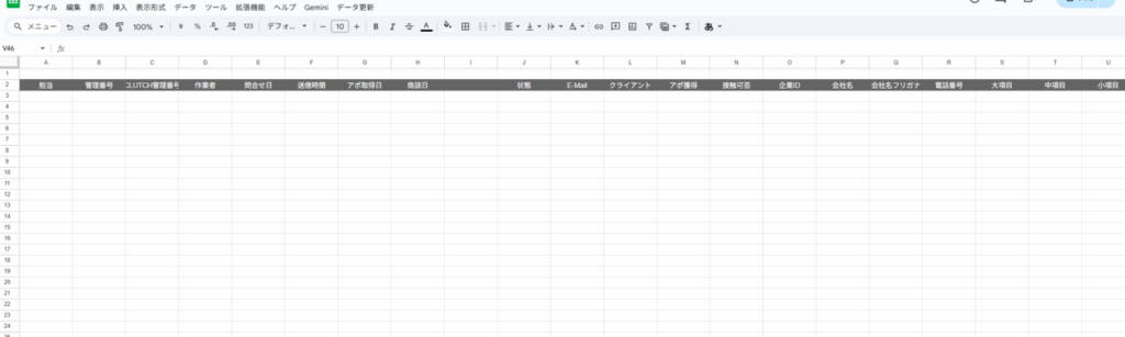 | 例) 1.スプレッドシートのフィルタ解除 2.データシート内のクリーニング ①改行削除 ②メールアドレスクリーニング ③メールアドレス生成 ④法人格削除データの生成 ⑤会社重複チェック ⑥削除リストチェック 3.CSV用シートの新規作成 4.スプレッドシートのフィルタをもとに戻す |